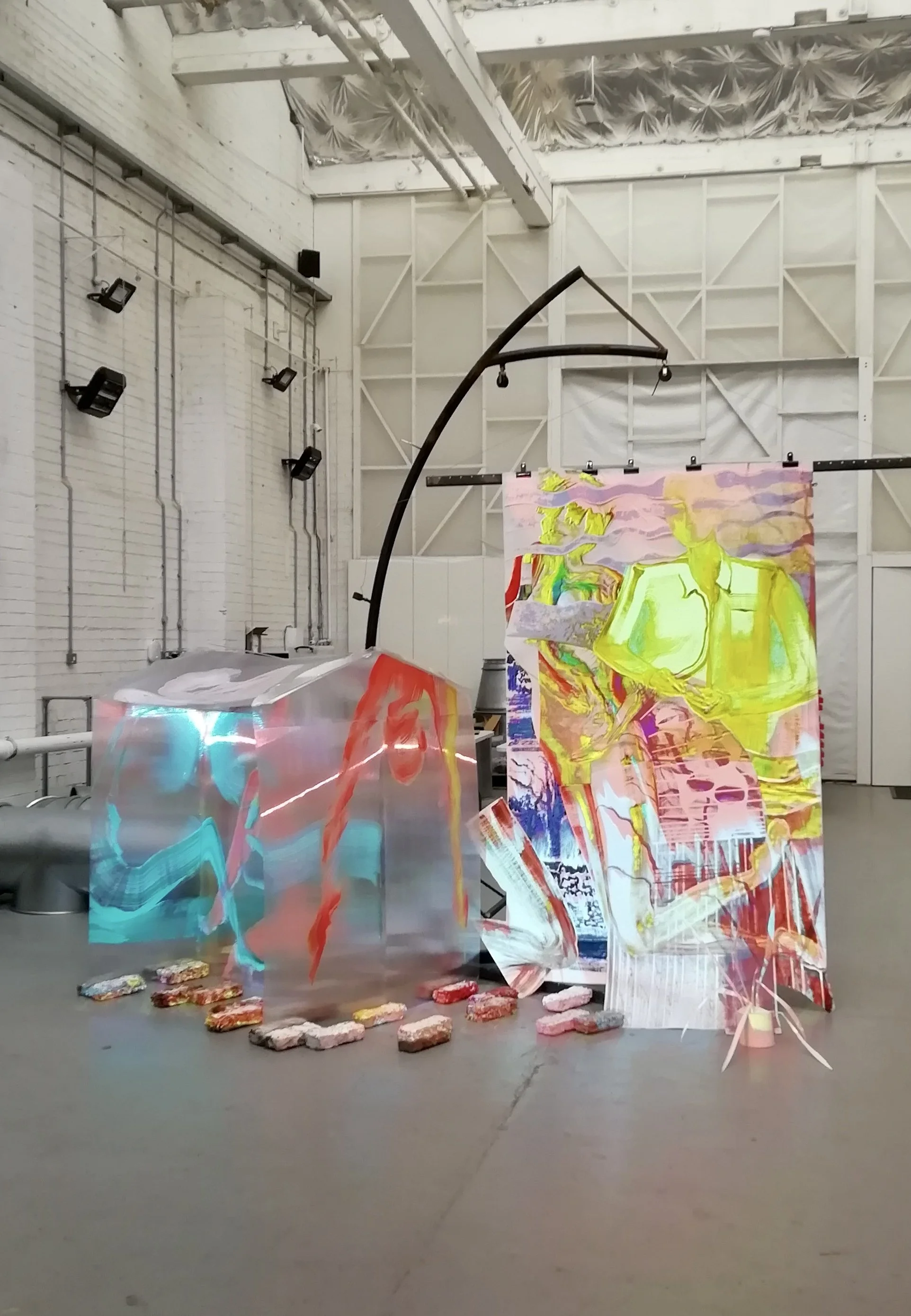 Drawing from experiences of growing up as a migrant through nods to Polish food and life, combined with navigating life in the UK, painting is used to represent both places and the complicated relationship of ‘home’. Paper and plastic function as the ’canvas’. Separate painted 2D and 3D elements are manipulated and arranged together, echoing how we might express or suppress different parts of ourselves. A soundscape of melody and abstracted conversation in Polish and English provides an insight into the sometimes challenging layers of identity and the cultural and societal factors.